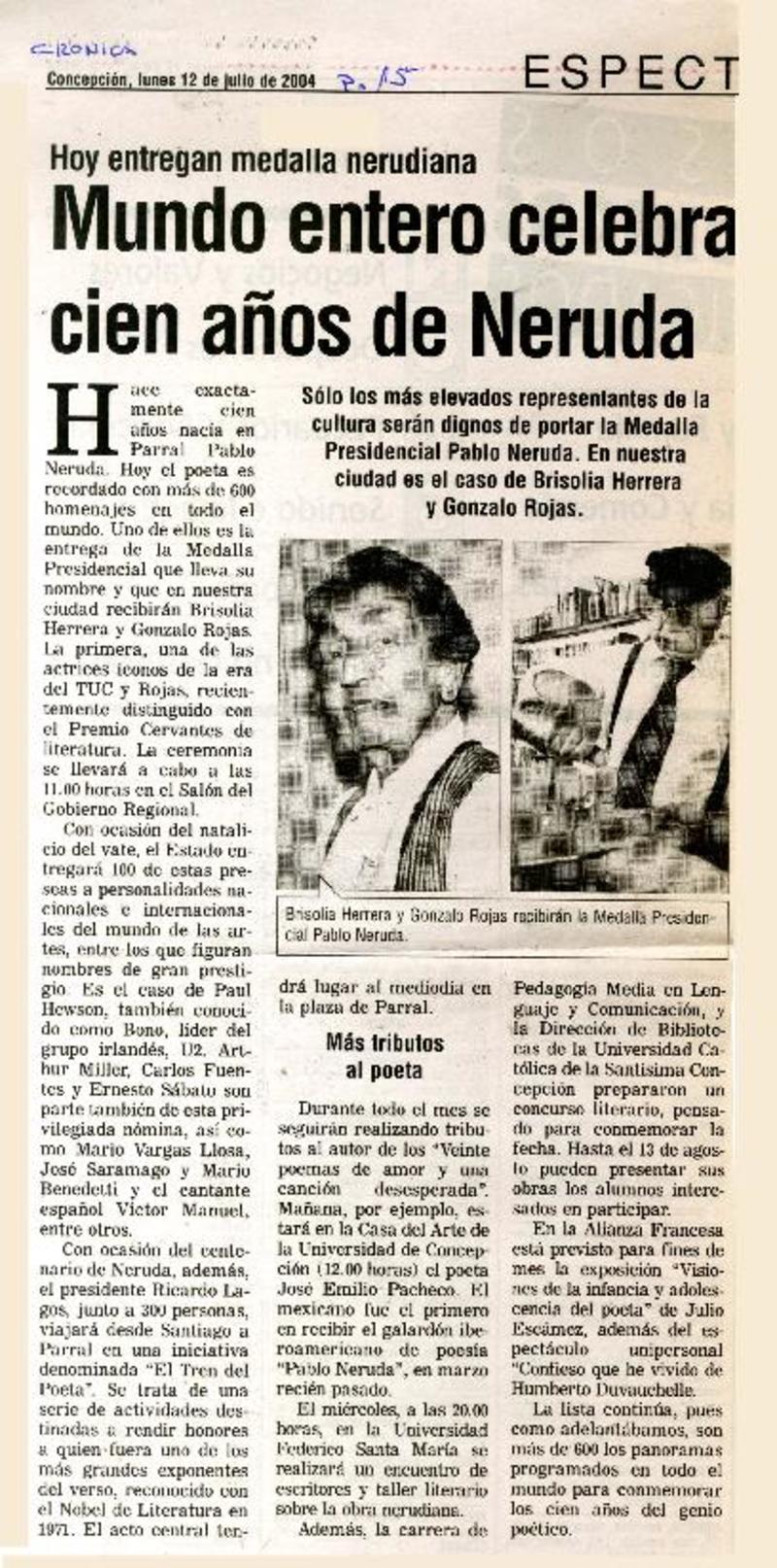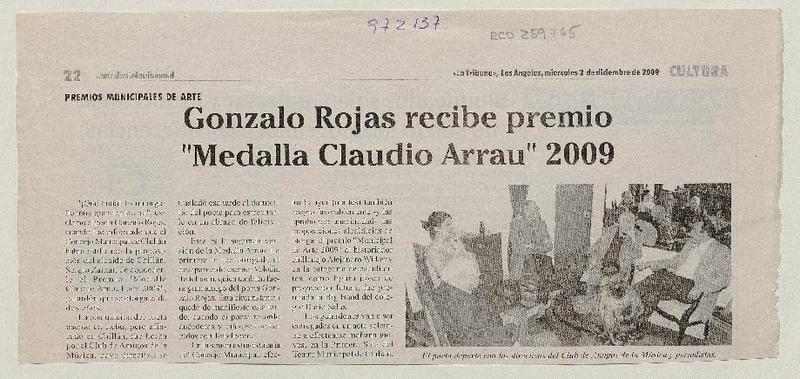 Comisión de cultura establece medalla Claudio Arrau para Gonzalo Rojas [artículo] Carolina Marcos.