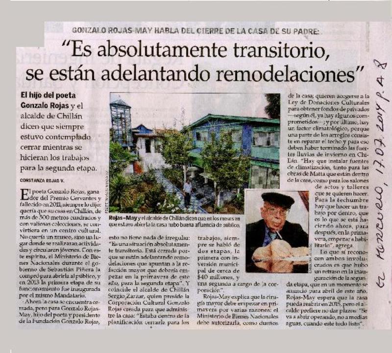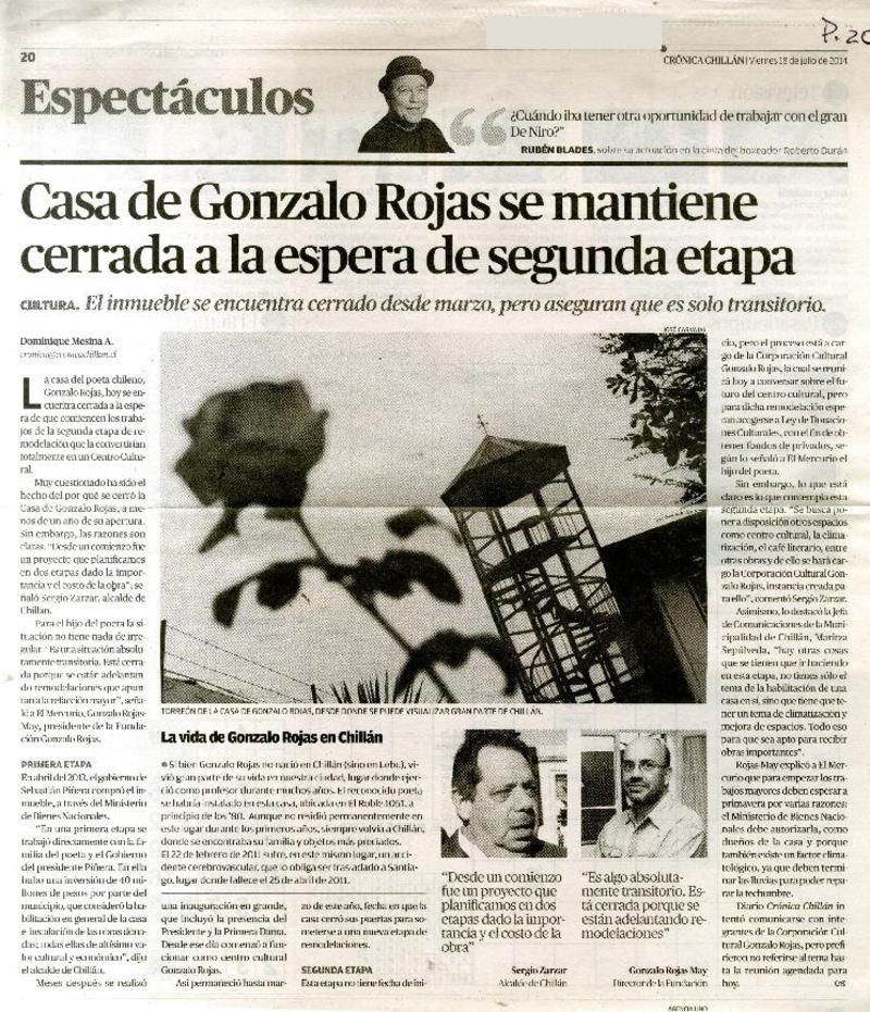 Casa de Gonzalo Rojas se mantiene cerrada a la espera de segunda etapa [artículo] Dominique Mesina A.