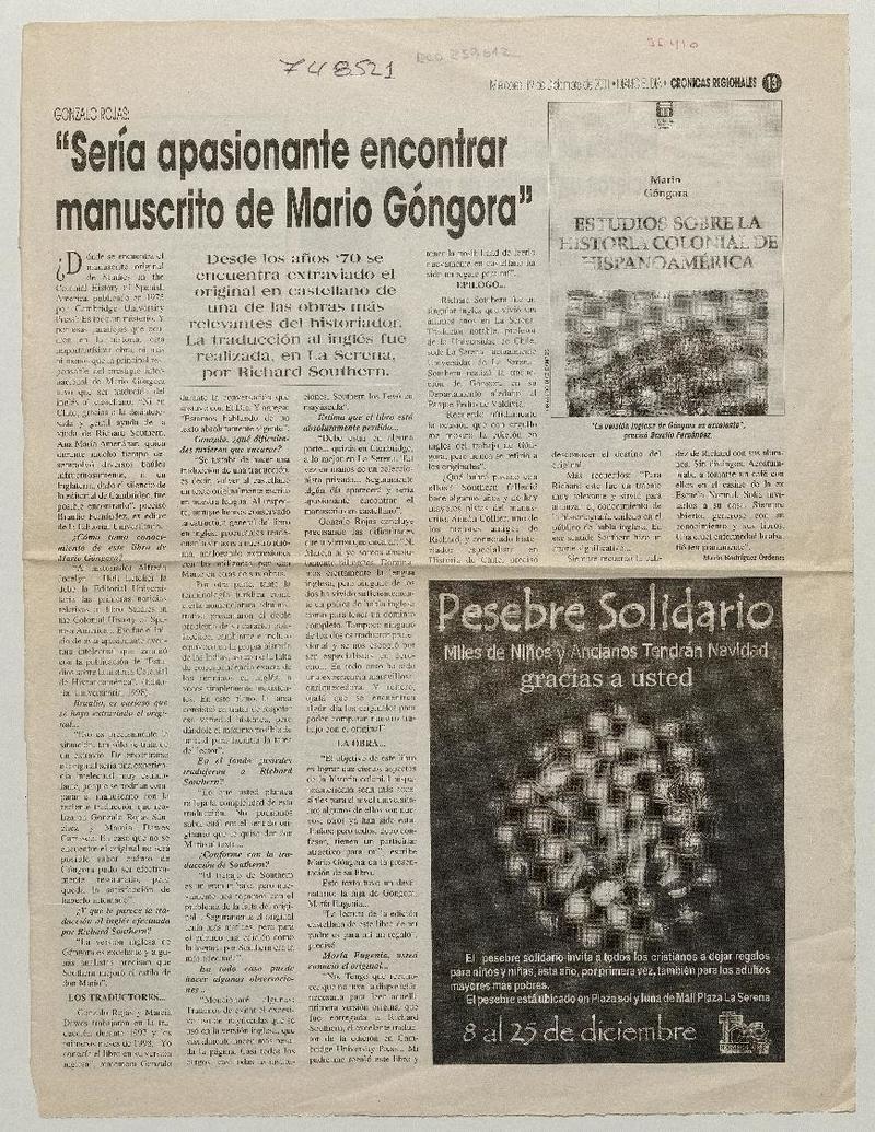 Sería apasionante encontrar manuscrito de Mario Gongora": [entrevistas] [artículo] Mario Rodríguez Ordenes.