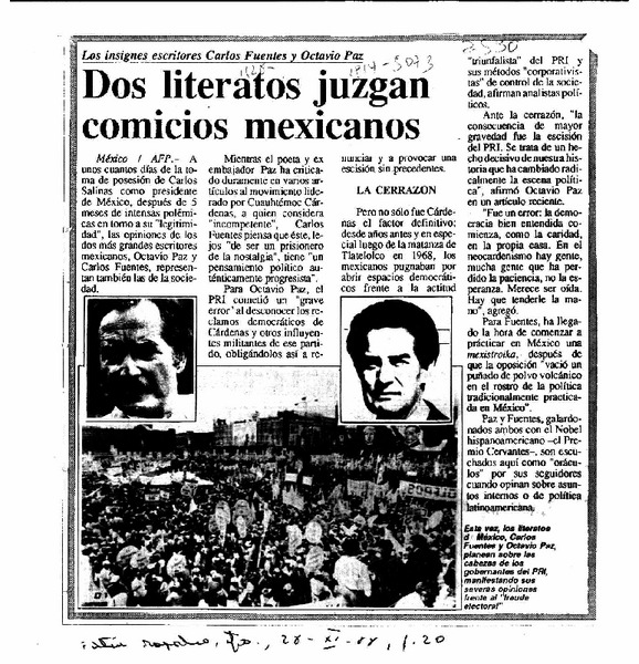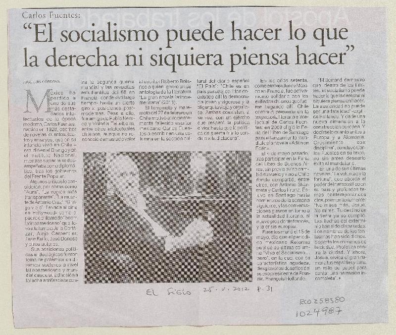 Carlos Fuentes llama a reforzar la democracia [artículo] Raúl Fuentes