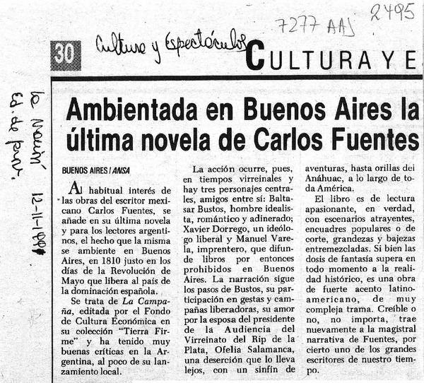 Ambientada en Buenos Aires la última novela de Carlos Fuentes [artículo].