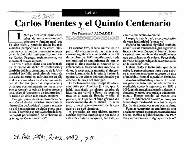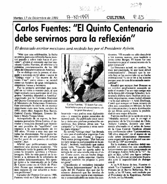 Carlos Fuentes, "El Quinto Centenario debe servirnos para la reflexión" [artículo].