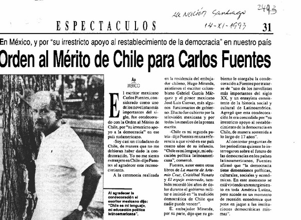 Orden al Mérito de Chile para Carlos Fuentes [artículo].