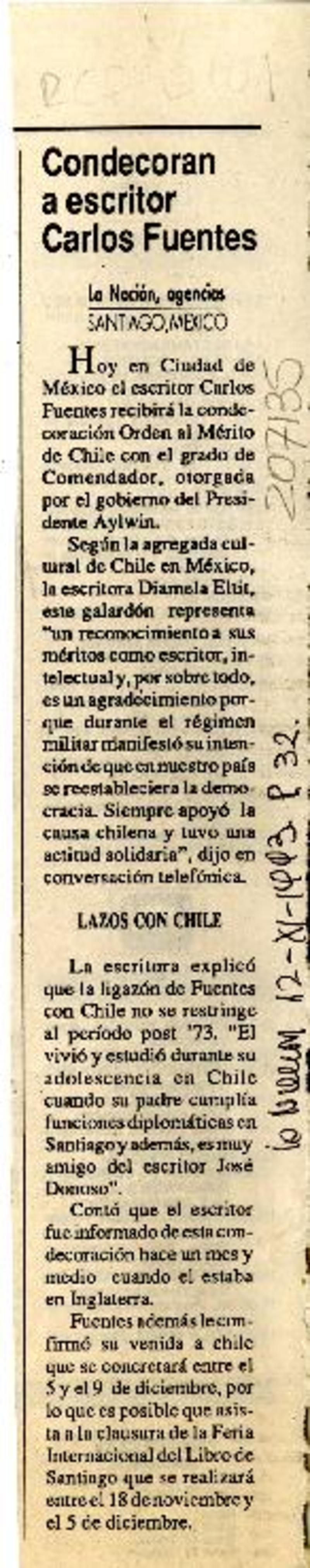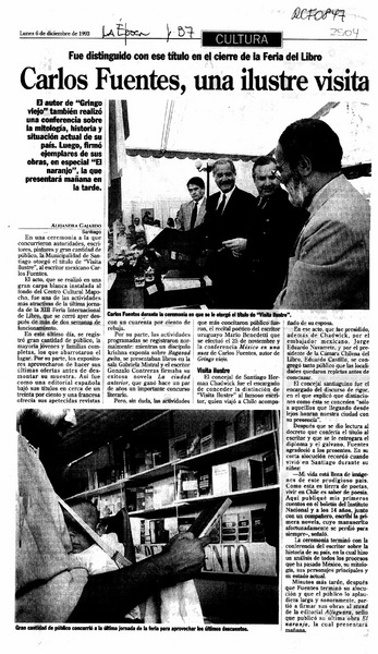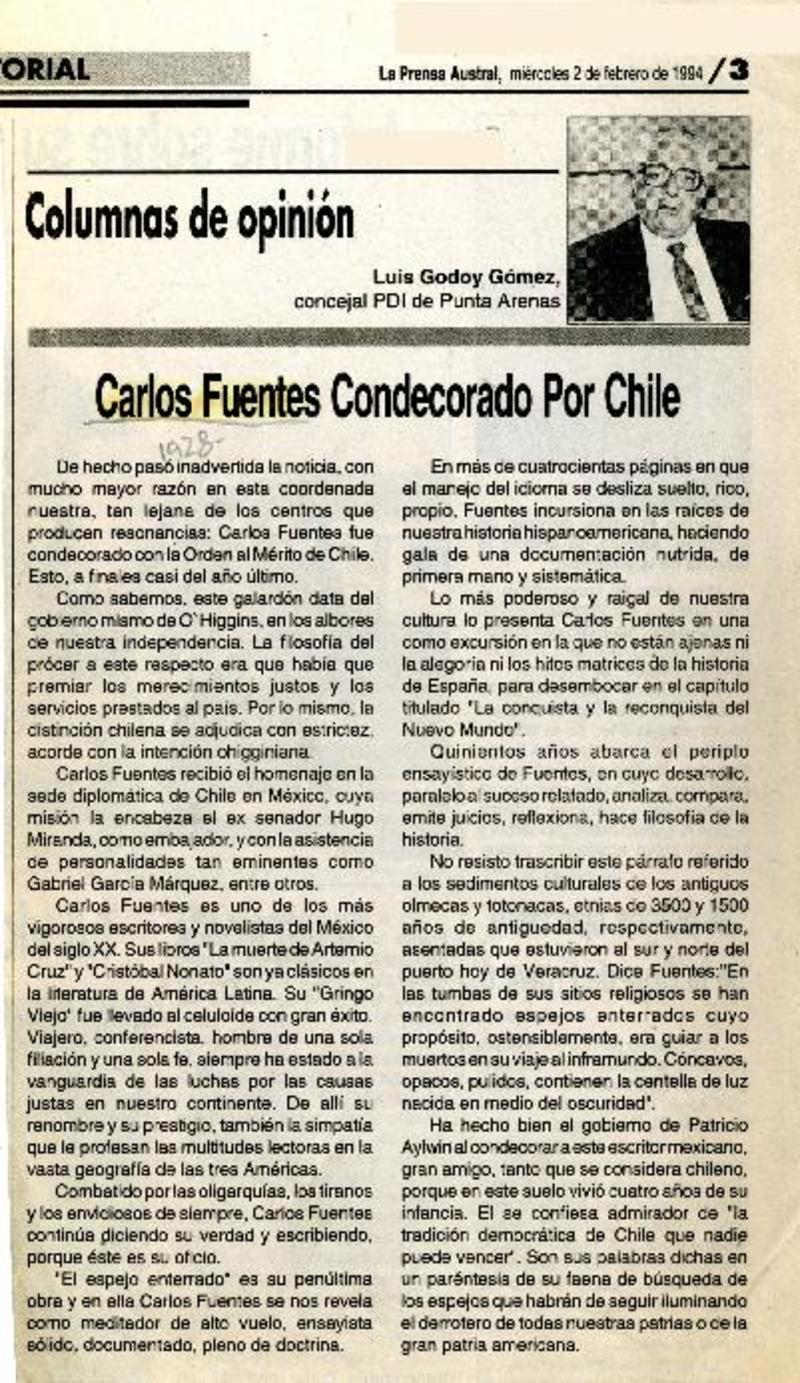Carlos Fuentes condecorado por Chile [artículo] Luis Godoy Gómez.