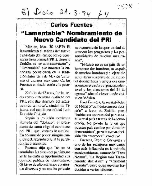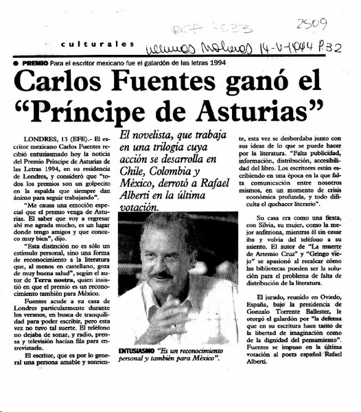 Carlos Fuentes es premio Príncipe de Asturias 1994 [artículo].