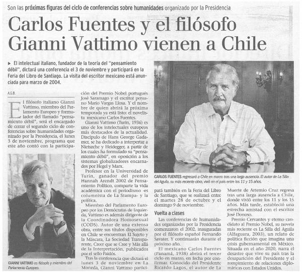 Carlos Fuentes y el filósofo Gianni Vattimo vienen a Chile [artículo] A.G.B.