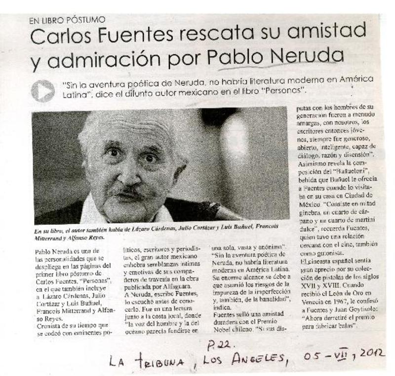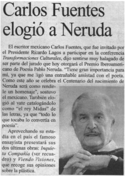 Carlos Fuentes rescata su amistad y admiración por Pablo Neruda. [artículo]