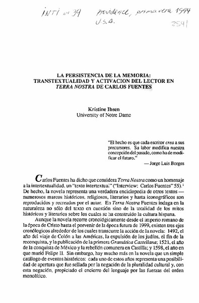 La Persistencia de la memoria: transexualidad y activación del lector en Terra Nostra de Carlos Fuentes [artículo] Kristine Ibsen.