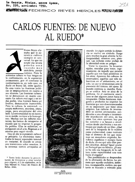 Carlos Fuentes: de nuevo al ruedo [artículo] Federico Reyes Heroles.