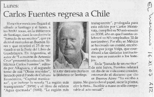 Carlos Fuentes presentará libro en Universidad de Chile. [artículo]