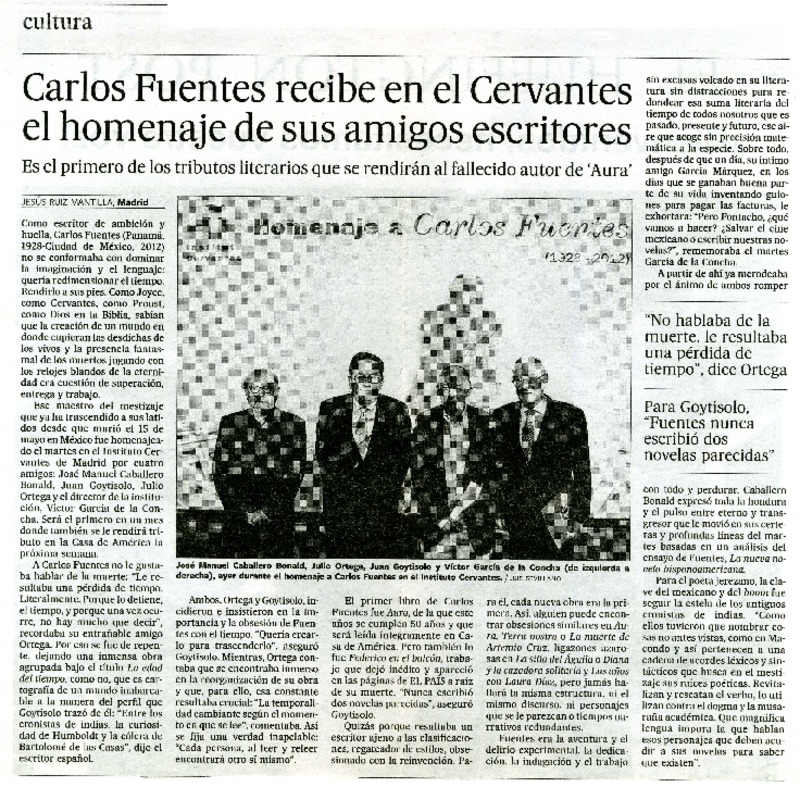 Carlos Fuentes recibe en el Cervantes el homenaje de sus amigos escritores [artículo] Jesús Ruiz Mantilla.