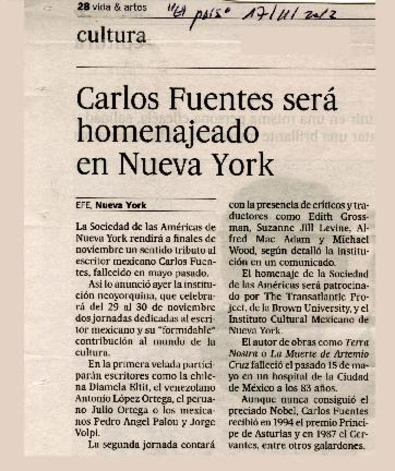 Carlos Fuentes será homenajeado en Nueva York [artículo]"