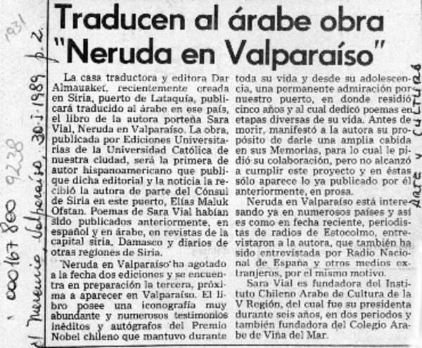 Traducen al árabe obra "Neruda en Valparaíso" [artículo].