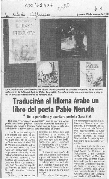 Traducirán al idioma arabe un libro del poeta Pablo Neruda [artículo].