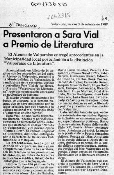 Sara Vial, Premio Municipal de Literatura [artículo].
