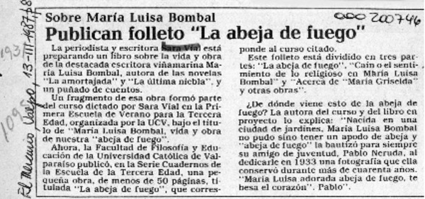 Publican folleto "La abeja de fuego", sobre María Luisa Bombal [artículo].