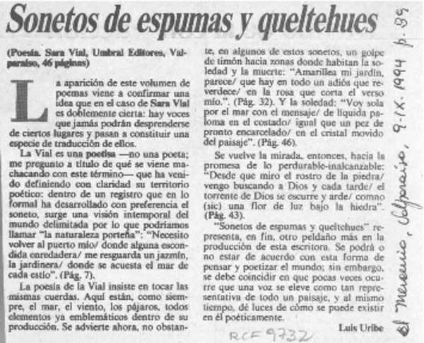 Sonetos de espumas y queltehues [artículo] Luis Uribe.