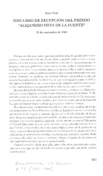 Discurso de recepción del Premio "Alejandro Silva de la Fuente" [artículo] Sara Vial.
