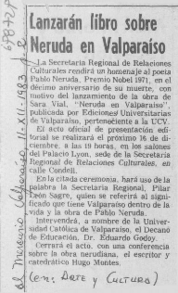 Lanzarán libro sobre Neruda en Valparaíso. [artículo]