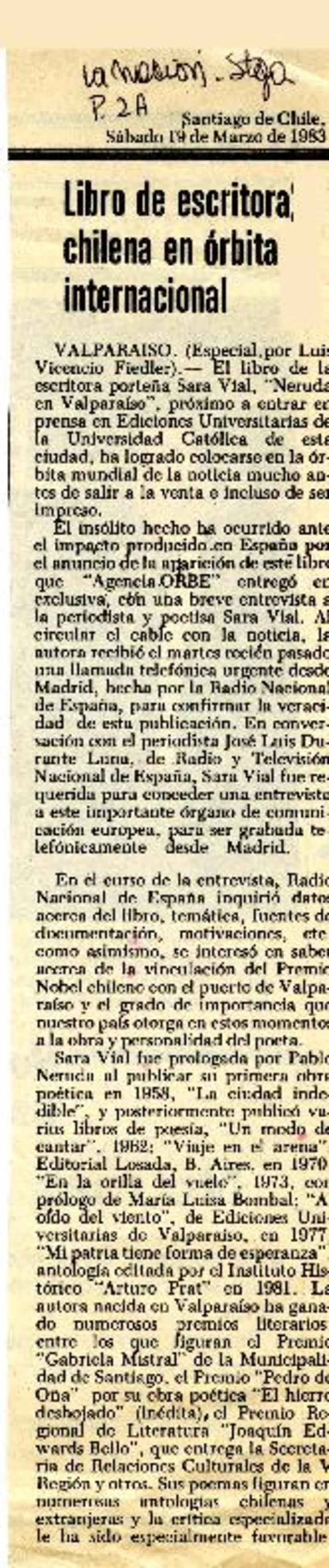Libro de escritora chilena en órbita internacional [artículo] Luis Vicencio Fiedler.