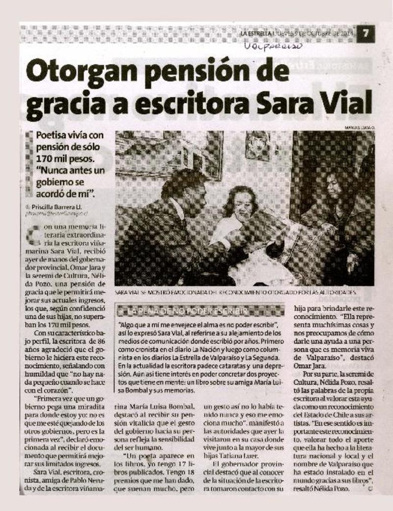 La Poetisa Sara Vial ganó el Premio Municipal de Literatura [artículo].