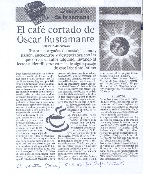 El café cortado de Oscar Bustamante [artículo] Patricio Moraga.