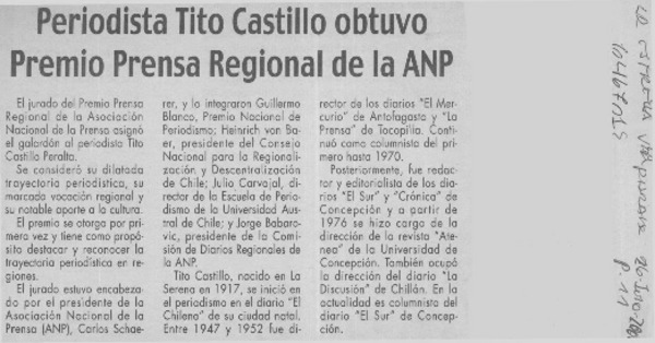 Tito Castillo Peralta, Premio Nacional de Periodismo 2001. [artículo]