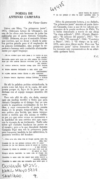 La poesía de Antonio Campaña [artículo] Víctor Castro.