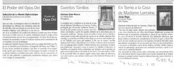Autores chilenos - Biggs Henning, Jorge - En torno a la casa de Madame Lorraine - Soto Rivera, Adriana - Cuentos tardíos
