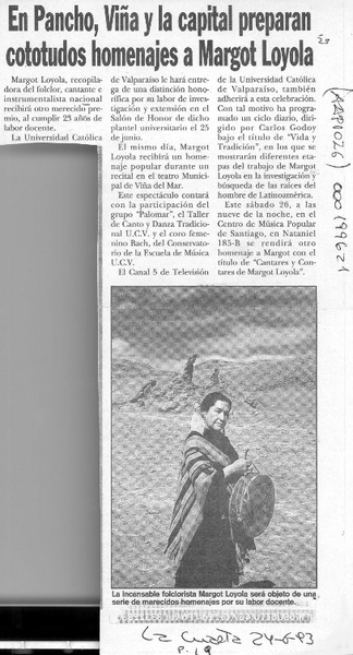 En Pancho, Viña y la capital preparan cototudos homenajes a Margot Loyola. [artículo]