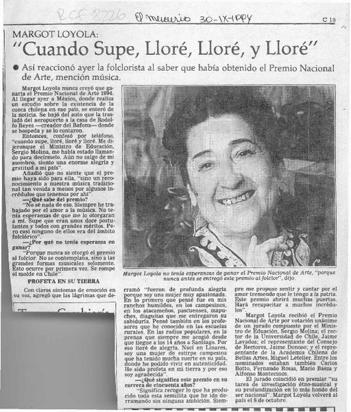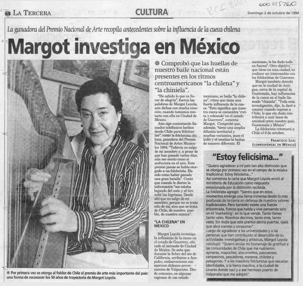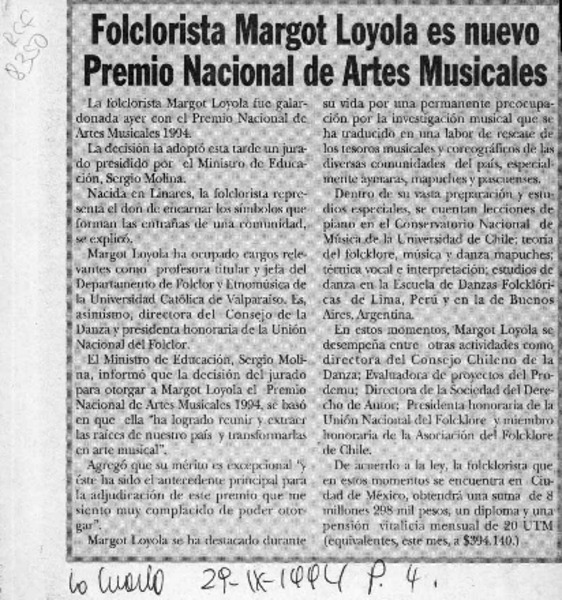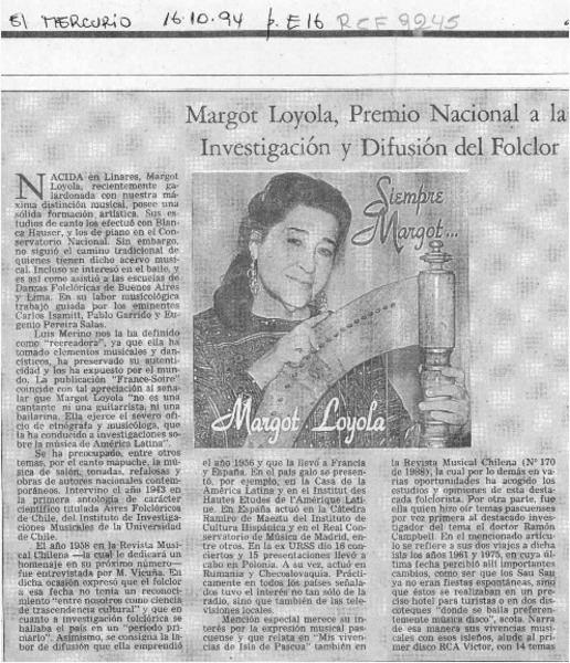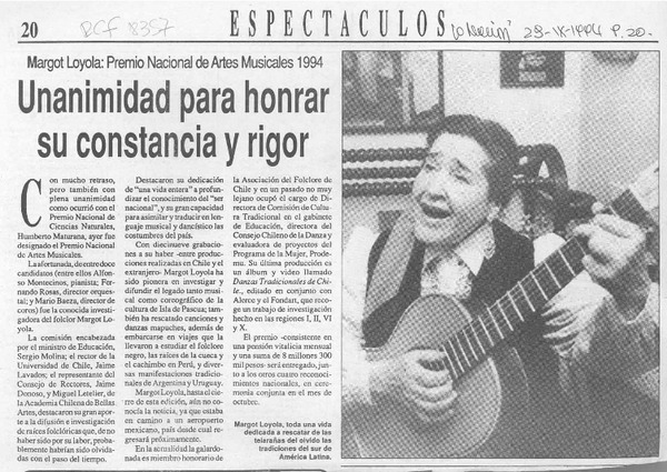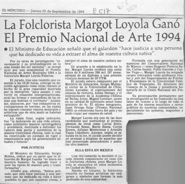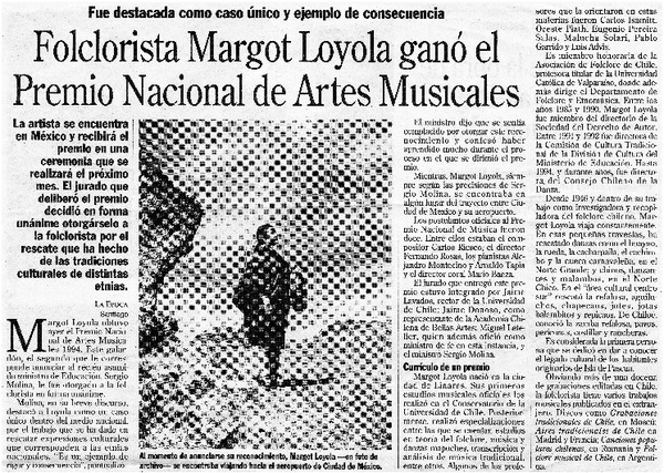 La Folclorista Margot Loyola ganó el Premio Nacional de Arte 1994 [artículo].