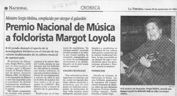 Premio Nacional de Música a folclorista Margot Loyla [artículo].