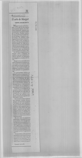 El arte de Margot [artículo] Manuel Antonio Matta.