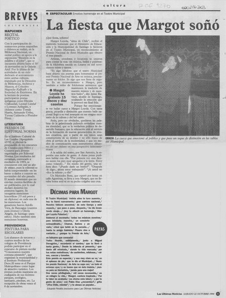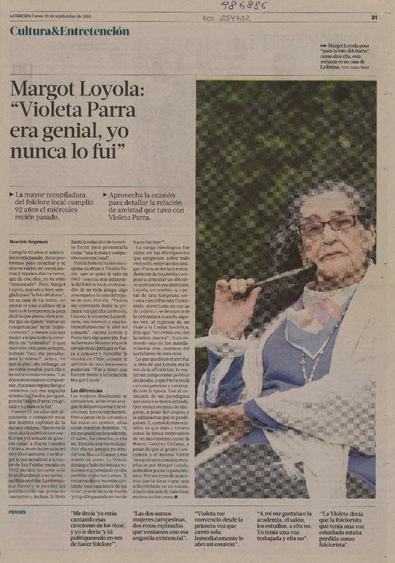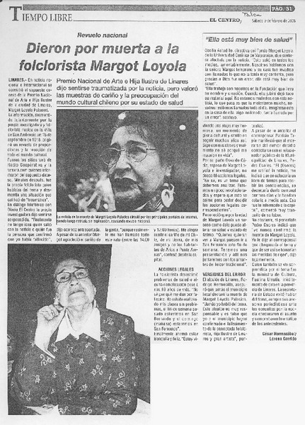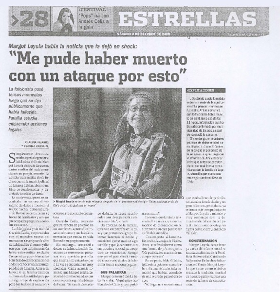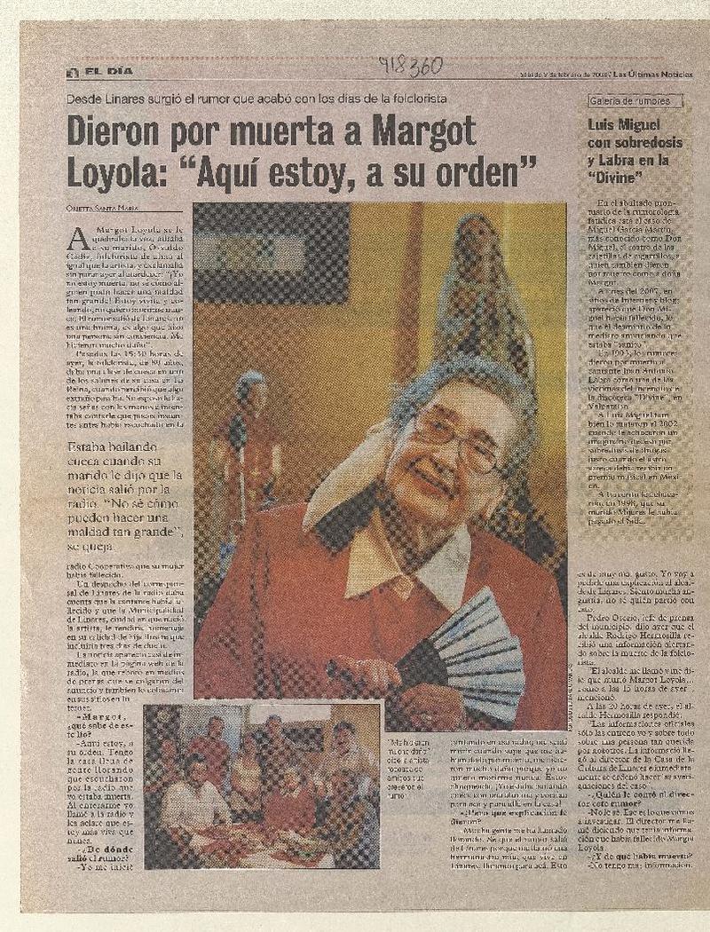 Dieron por muerta a Margot Loyola: "aquí estoy, a su orden" (entrevista) [artículo]Orietta Santa María.