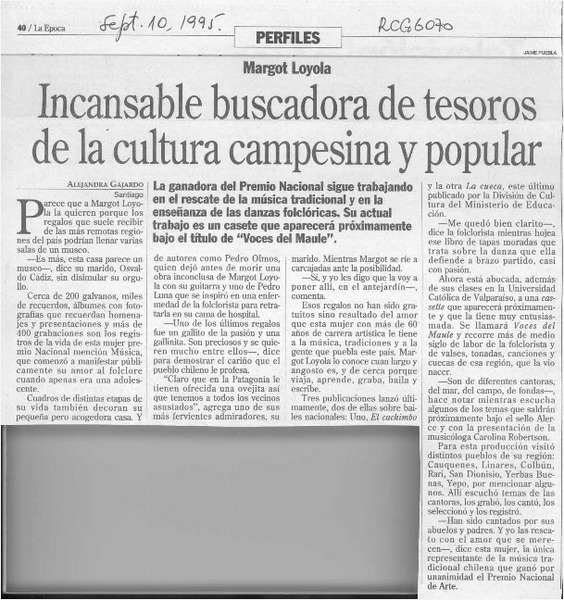 Incansable buscadora de tesoros de la cultura popular campesina y popular [artículo] Alejandra Gajardo.