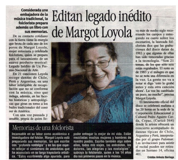 Editan legado inédito de Margot Loyola [artículo] Cristián Arévalo Iturriaga.