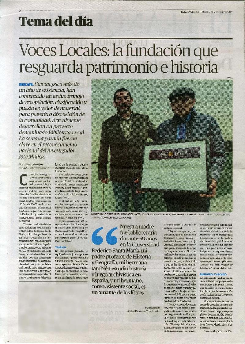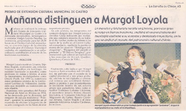 Premio de extensión cultural municipal de Castro : mañana distinguen a Margot Loyola [artículo]
