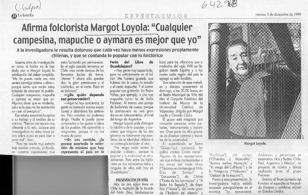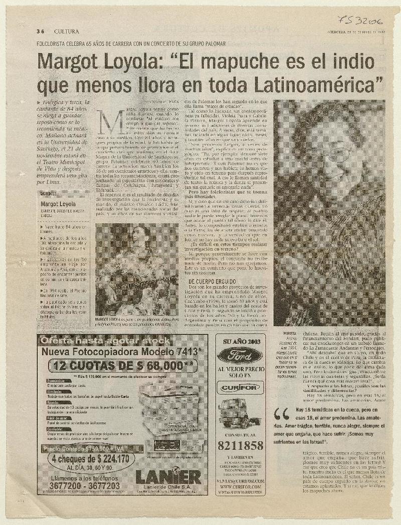 Margot Loyola, "el mapuche es el indio que menos llora en toda Latinoamérica" [entrevistas] [artículo] : Cristóbal Peña.