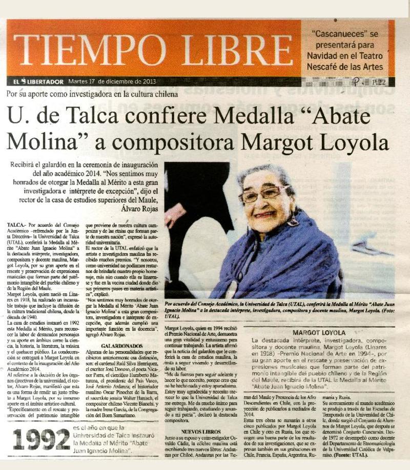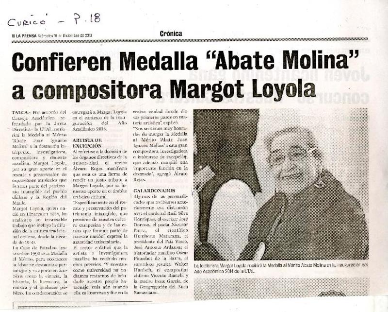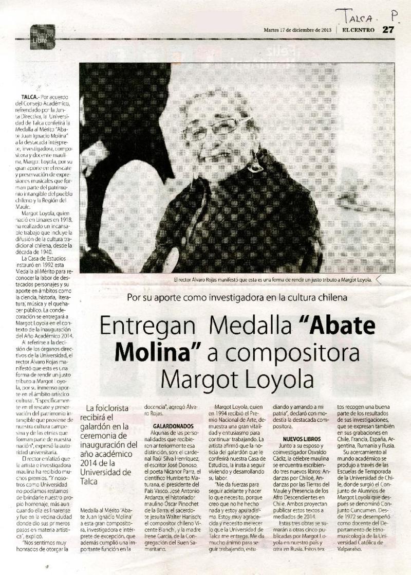 U. de Talca confiere medalla "Abate Molina" a compositora Margot Loyola. [artículo]