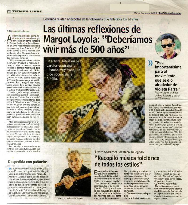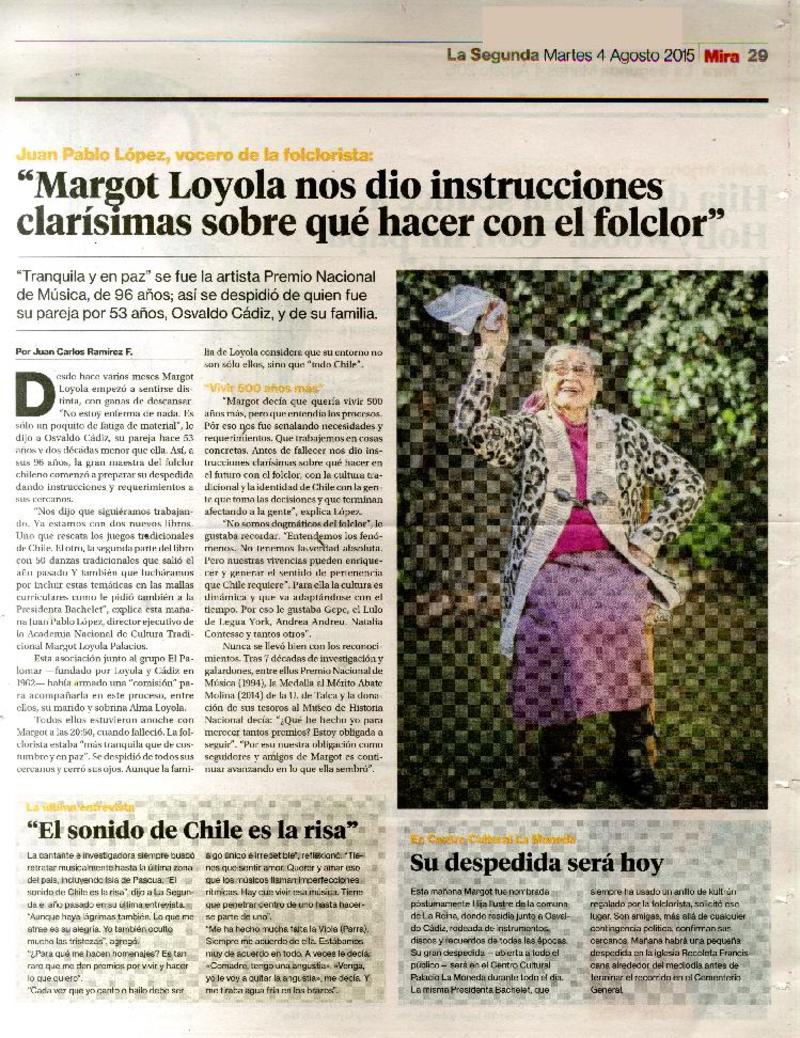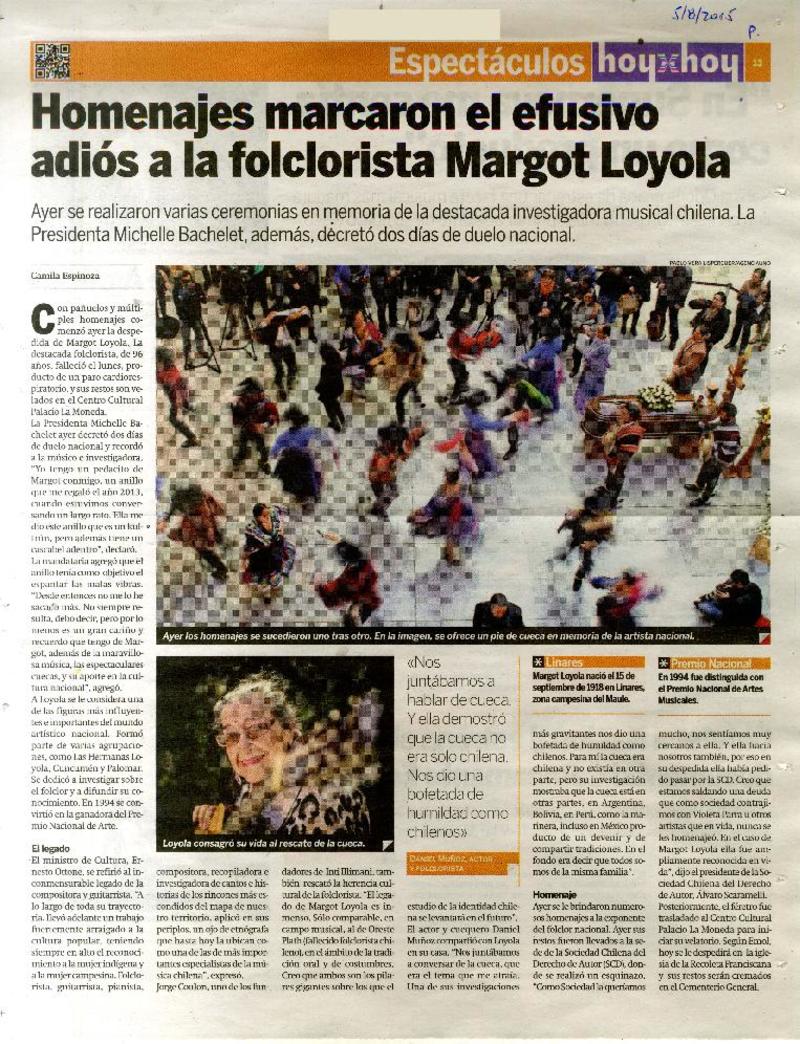 Homenajes marcaron el efusivo adiós a la folclorista Margot Loyola [artículo] Camila Espinoza.