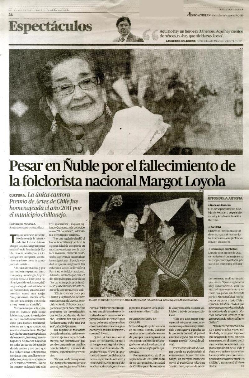 Pesar en Ñuble por el fallecimiento de la folclorista nacional Margot Loyola [artículo] Dominique Mesina A.