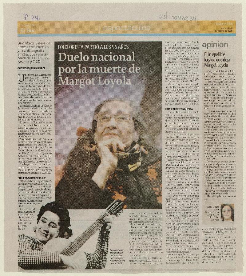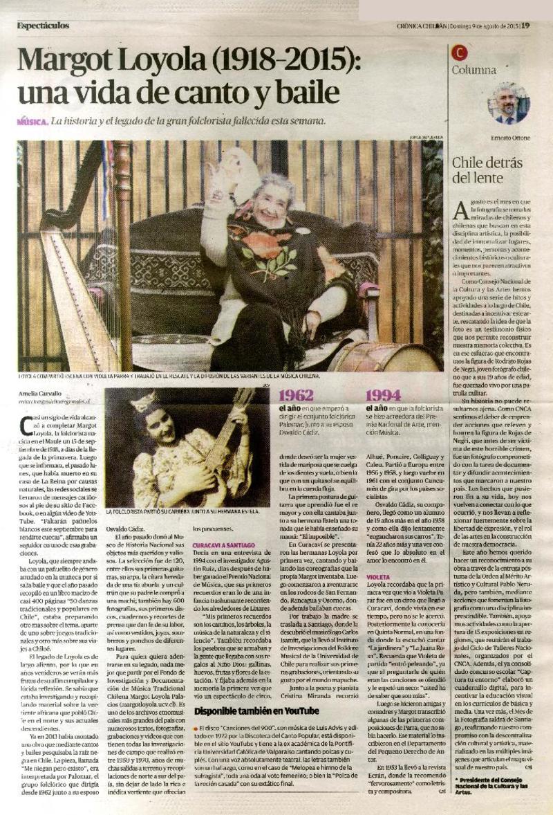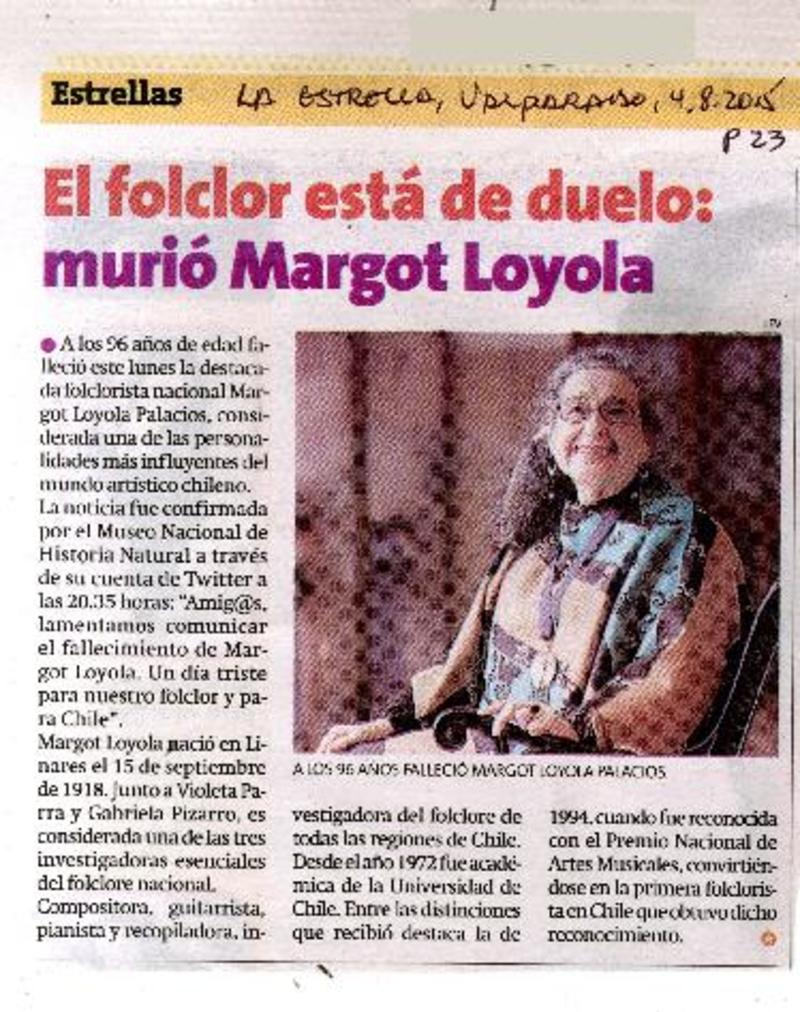 Muere Margot Loyola, maestra del folclor chileno [artículo] Andrés del Real.