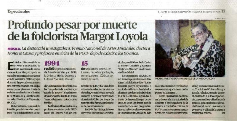 Profundo pesar por muerte de la folclorista Margot Loyola. [artículo]
