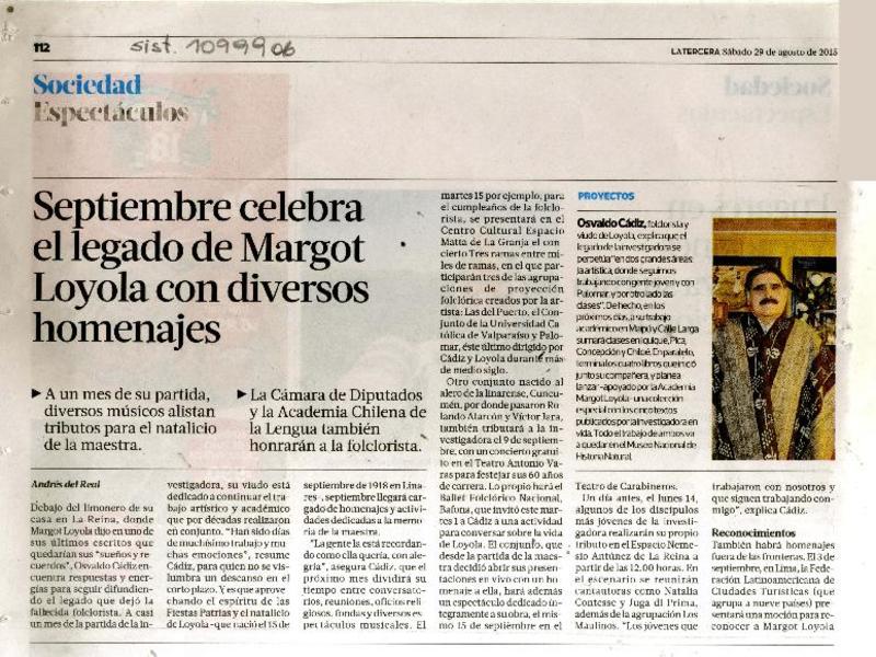 Septiembre celebra el legado de Margot Loyola con diversos homenajes [artículo] Antonio del Real.