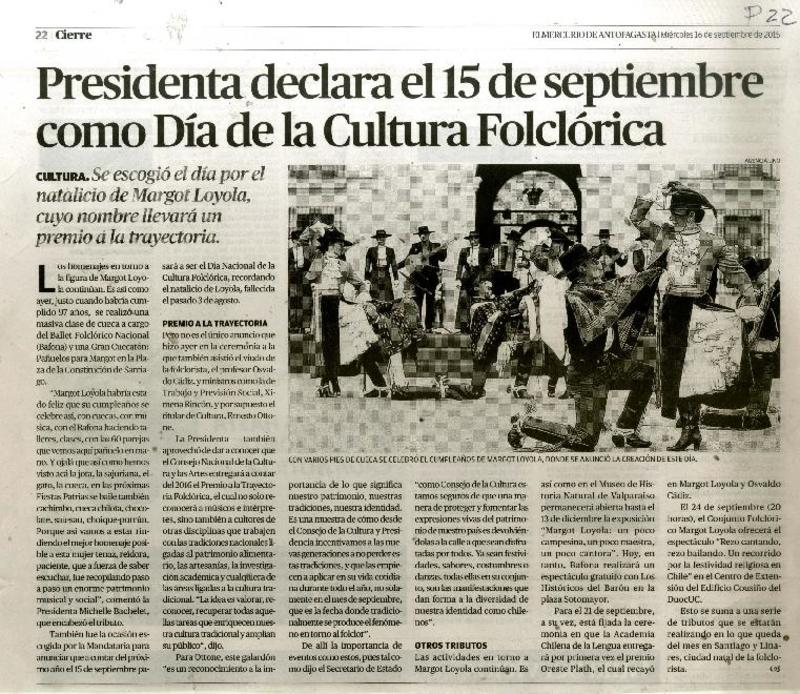 Presidenta declara el 15 de septiembre como día de a cultura folclórica. [artículo]