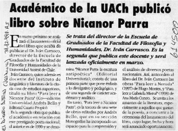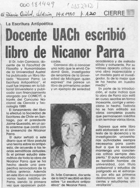 Académico de la UACh publicó libro sobre Nicanor Parra [artículo]