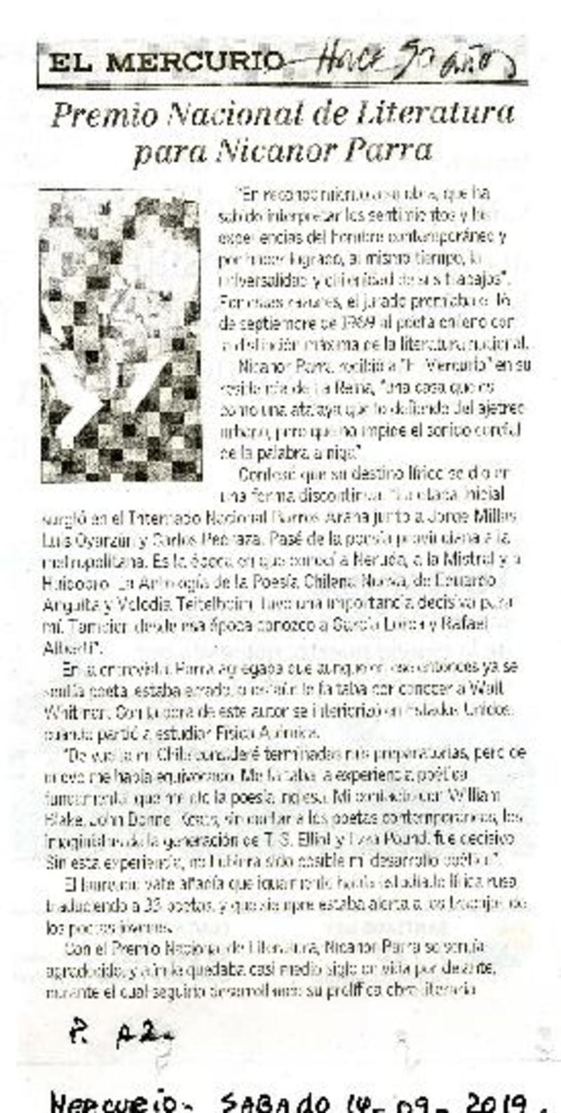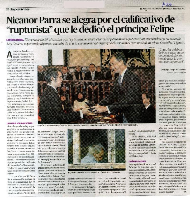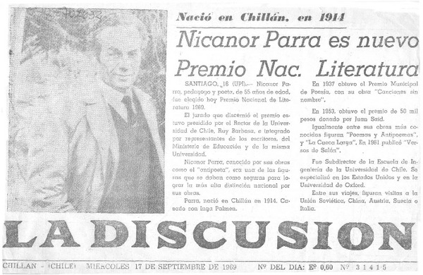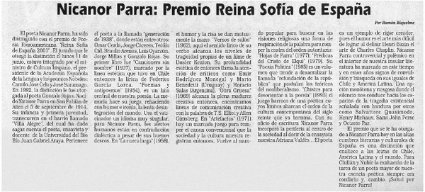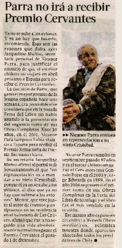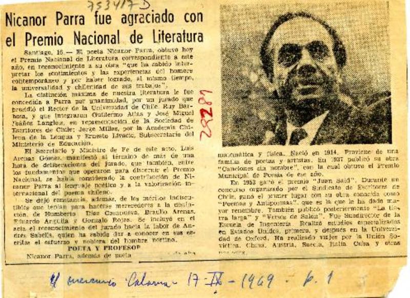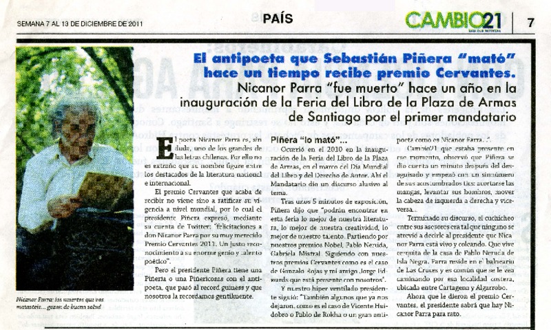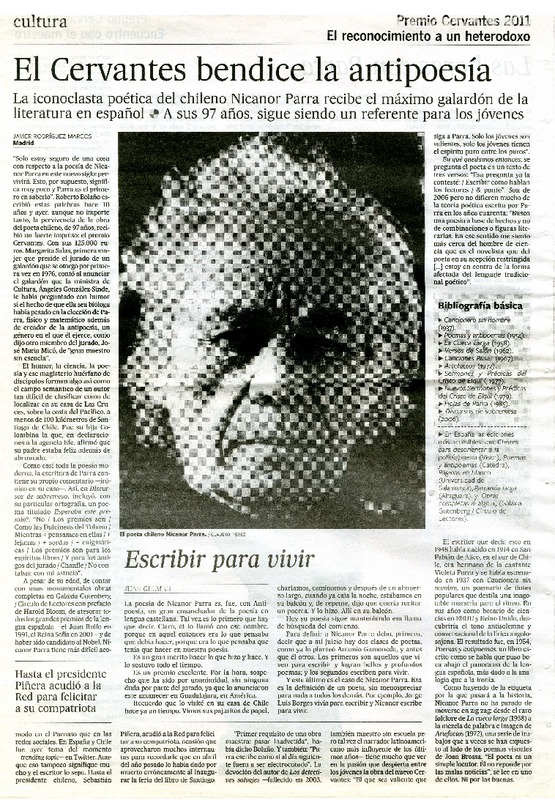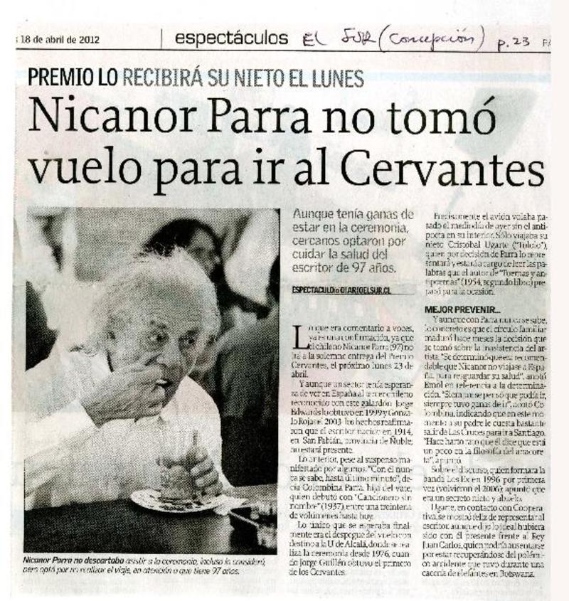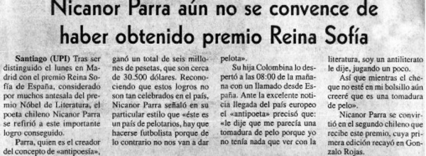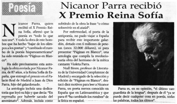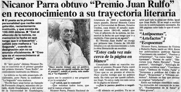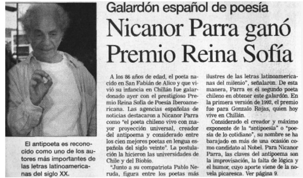 Alegría por galardón para poeta Nicanor Parra [artículo]