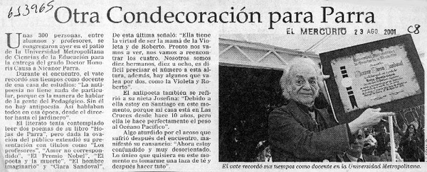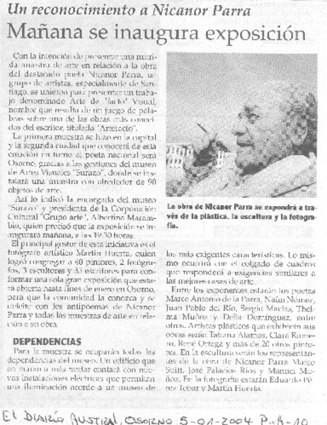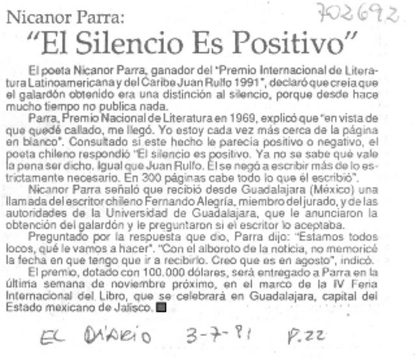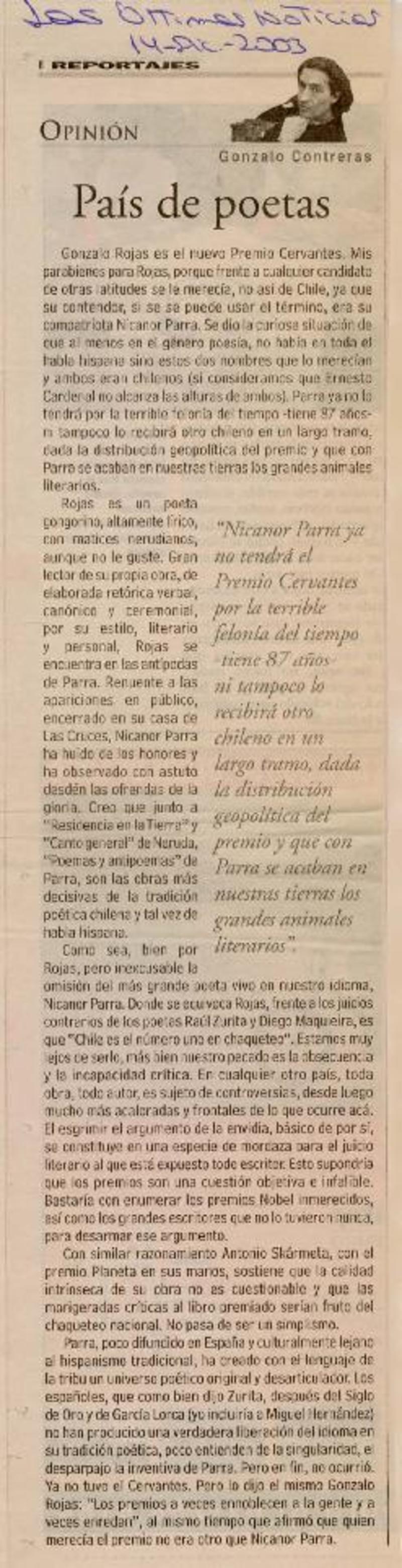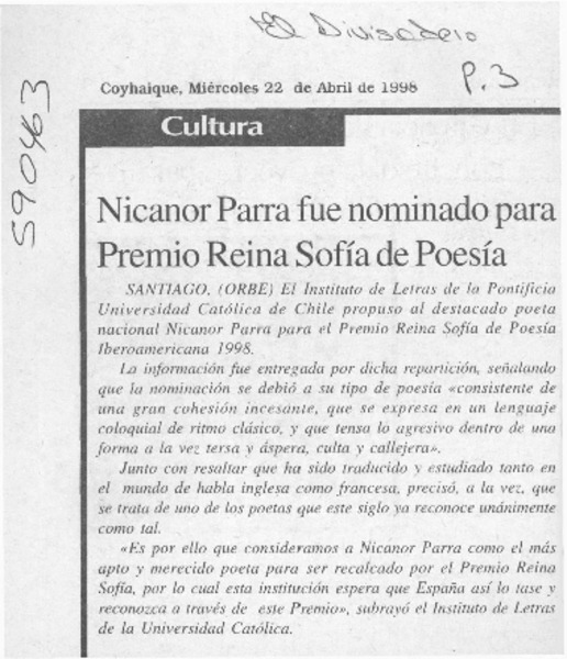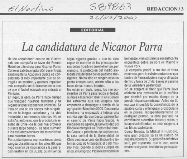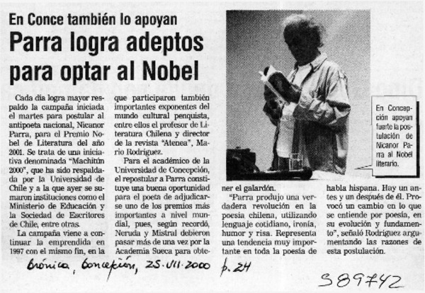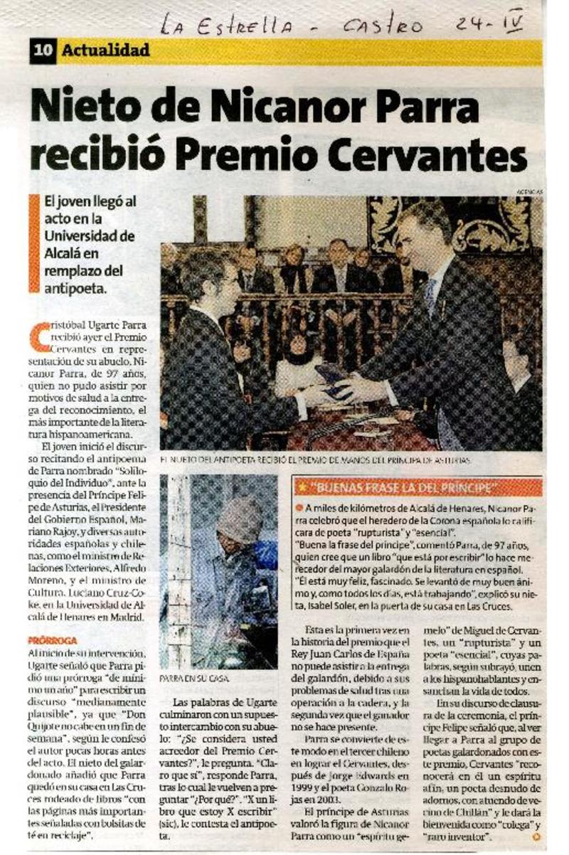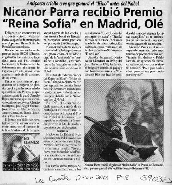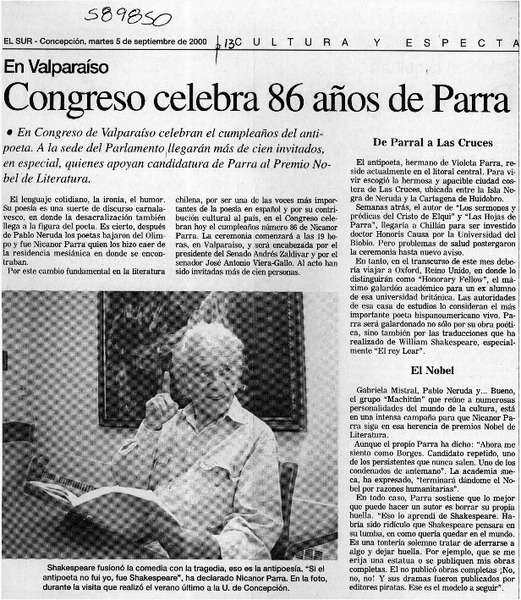 Alegría por galardón para poeta Nicanor Parra [artículo]