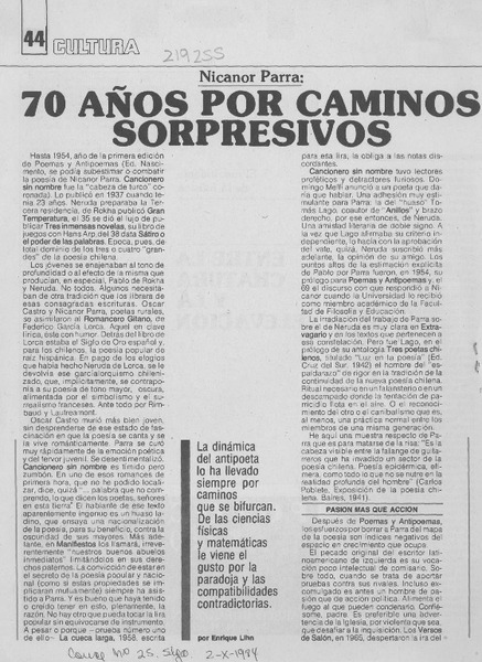 70 años por caminos sorpresivos [artículo] Enrique Lihn.