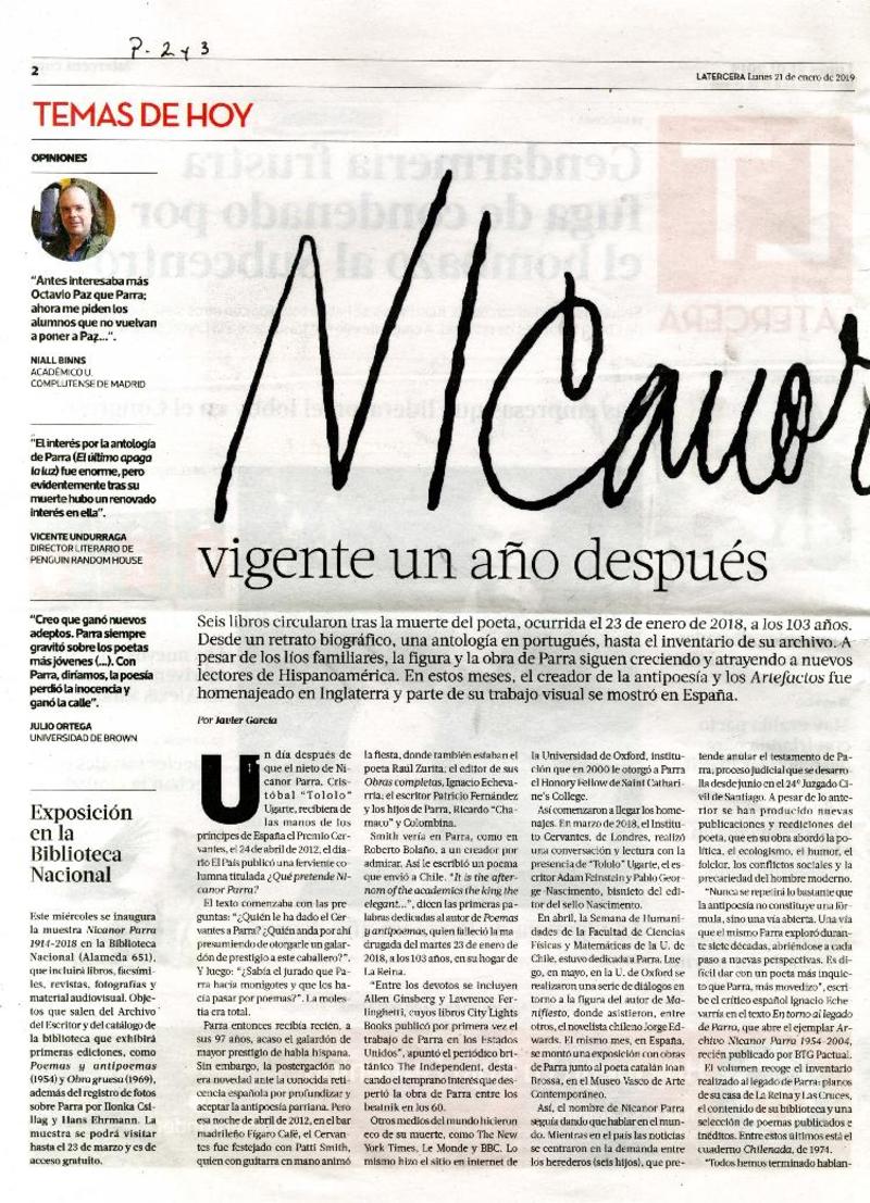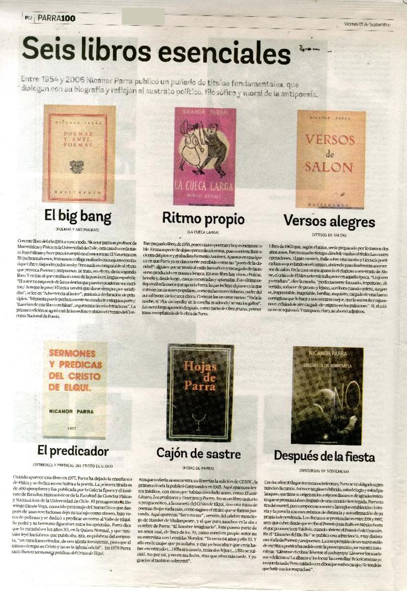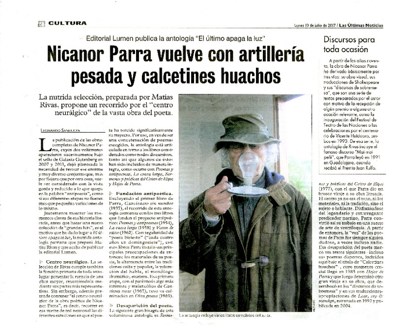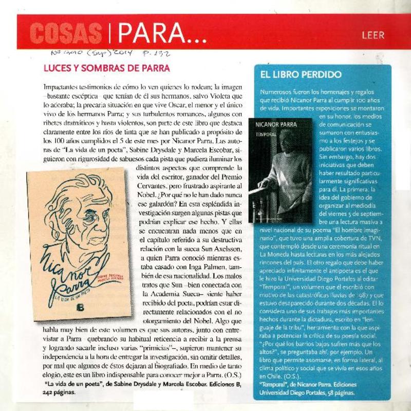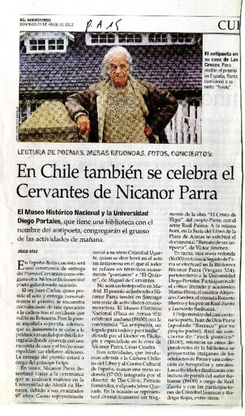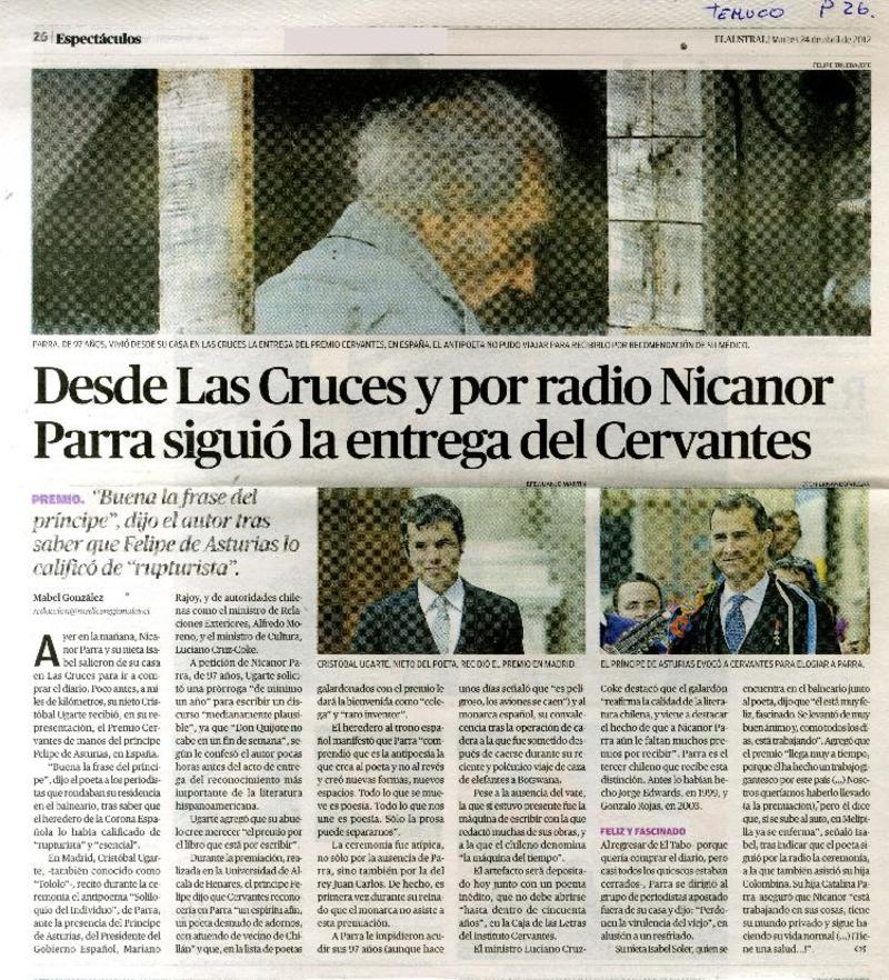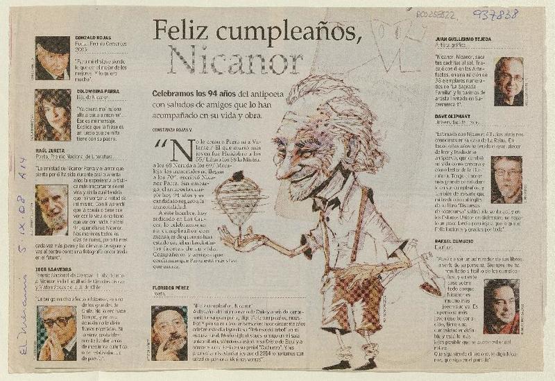 Un nuevo libro celebra a Nicanor Parra por su Premio Cervantes [artículo] Constanza Rojas Valdés.